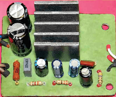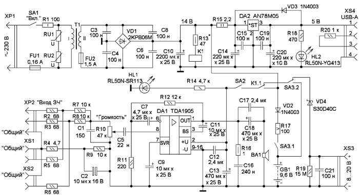 Диодный мост 2KPB06M можно заменить любым из серий 2KPB01-2KPB05, RC201-RC207, RS201-RS207, 2W01G- 2W10G или аналогичными с допустимым током 2 А. Взамен диода Шотки S30D40С (сборка) можно установить любой из 1 N5822, SR306, SR506, SB540, SRAF560, SBL2060, MBRS360T3, MBRD660CT, MBR360,MBR1060, 30BQ040. Диоды 1N4003 можно заме-нитьлюбыми из серий 1N4001 - 1N4007, UF4001 - UF4007, BYT52A- BYT52M, КД208, КД243. Светодиоды RL50N-YG413 (зелёного свечения) и RL50N-SR113 (красного свечения) могут быть заменены любыми аналогичными с повышенной яркостью, например, из серий КИПД21, КИПД40, КИПД66. Микросхему AN78M05 можно заменить любой из серии ххх78M05. Микросхема TDA1905 установлена на ребристый дюралюминиевый теплоотвод площадью охлаждающей поверхности 30 см2. Она может быть заменена на TDA1904 и должна быть установлена на теплоотвод площадью 20 см2. Кроме того, к её выводам 9 - 16 большим количеством припоя припаян П-образный теплоотвод из двух отрезков медной проволоки длиной по 10 см и диаметром 1,2 мм.
