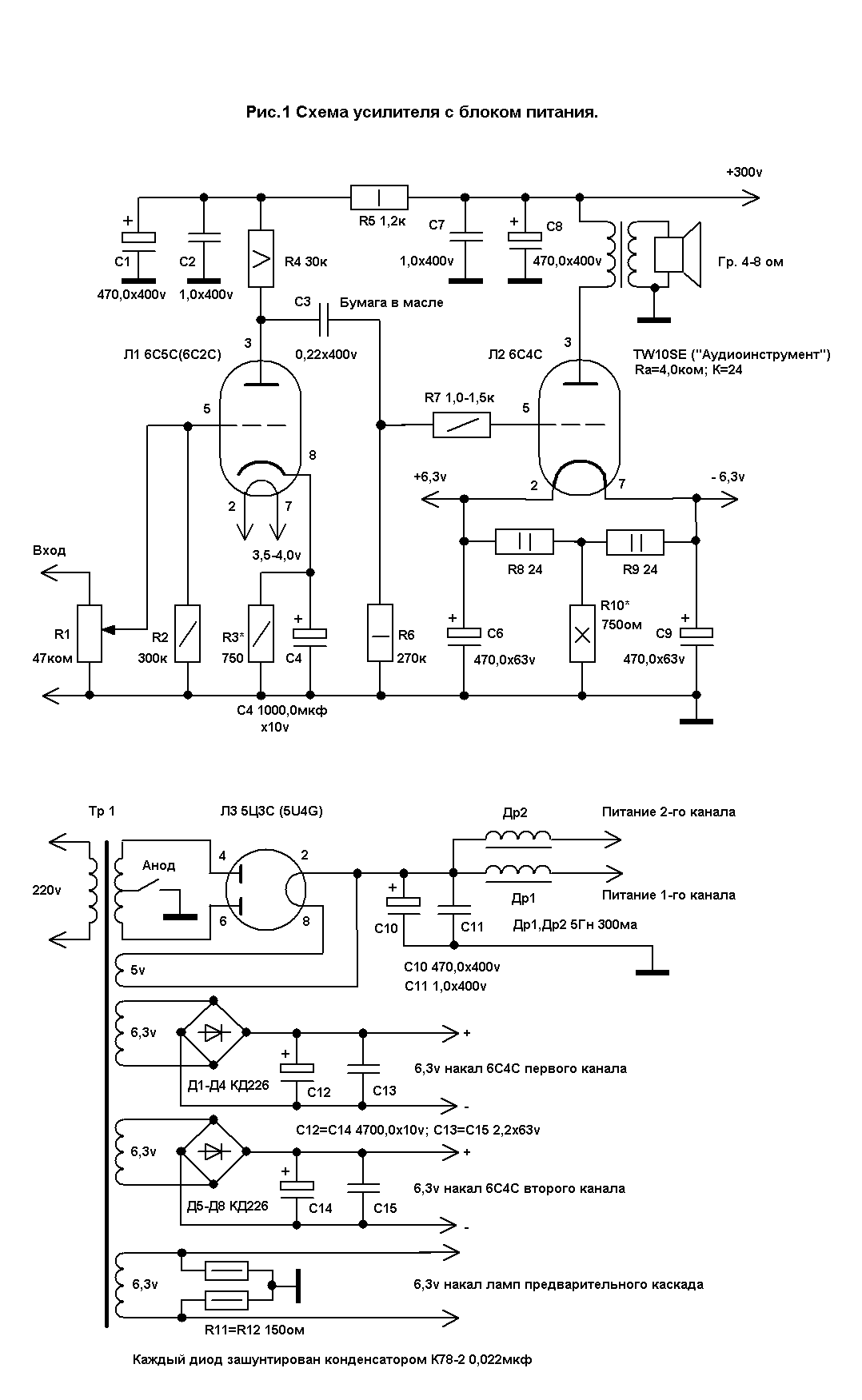 Предварительный каскад усиления - резистивный. Поскольку расчёты каскада на резисторах есть практически в любой литературе и Интернете, я их не привожу. Считаю, что в нашем случае полезнее будет сказать о звучании ламп предварительного усилителя. При обсуждении схемы усилителя с А. И. Манаковым, им была предложена лампа 6С5С, как наиболее линейная, имеющая цилиндрическую конструкцию электродной системы. На втором месте - 6С2С. Если Вы откроете справочник, то увидите, что параметры этих ламп практически одинаковы, чего не скажешь о внутренней конструкции. Этим объясняется и разница в звучании. Несмотря на индивидуальные особенности (а они есть), обе лампы звучат очень хорошо. Недостатков я не заметил (один триод в баллоне я не считаю недостатком, скорее достоинством). Предлагаю Вам попробовать оба варианта и определиться, какой из них больше нравится, тем более что переделывать ничего не нужно. Если Вы не смогли найти эти лампы, применяйте двойной триод 6Н8С (обе половинки соединяем параллельно). Особенности такого включения описаны в моей прошлой статье "Однотактный ламповый…, возвращаясь к напечатанному", поэтому повторяться не буду. Можно также использовать лампу 6Н8С без соединения половинок в параллель, в этом случае одна лампа будет работать на оба канала (экономия места налицо).