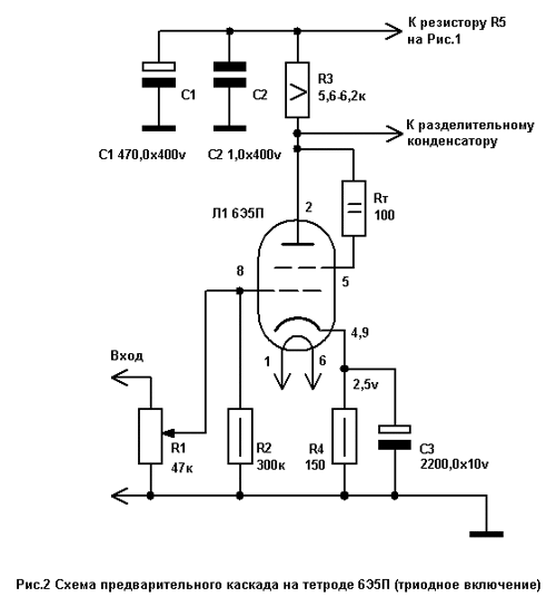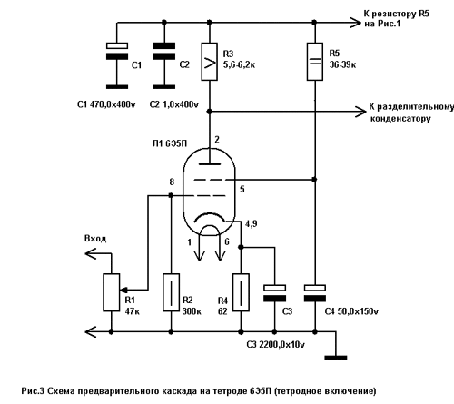 Теперь переходим к случаям, когда входное напряжение усилителя меньше двух вольт или когда в выходном каскаде применяется лампа, требующая большого напряжения раскачки (например, 6С33С). На Рис.2 приведена схема предварительного усилителя на тетроде 6Э5П в триодном включении, а на Рис.3 в штатном тетродном включении.