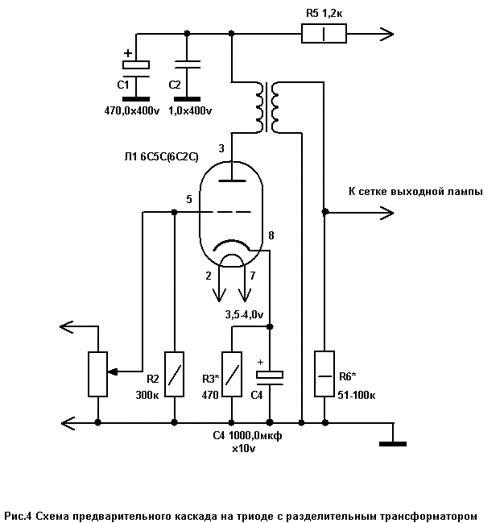 Если же выходное напряжение вашего источника сигнала небольшое, то можно поступить следующим образом. Во-первых, можно применить лампу с большим коэффициентом усиления, например 6Н9С, 6Н2П, ЕСС83, E41CC. Во-вторых, применить разделительный трансформатор с коэффициентом 1:2. В-третьих, использовать в качестве лампы предварительного каскада пентод (тетрод). Противникам применения пентодов могу сказать, что лучшие образцы однотактных ламповых усилителей прошлого века, имели именно пентод во входном каскаде, а их звучание до сих пор считается эталонным. Чуть ниже я приведу схемы предварительных ламповых каскадов на пентоде и схему, в которой используется разделительный трансформатор.