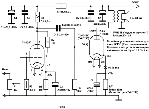 Ток покоя, как всегда, контролируем по падению напряжения на катодных резисторах. Если Вы примените детали, указанные на схеме, то он составит 55-60ма для лампы 6С4С и 5-6ма для лампы 6С5С.