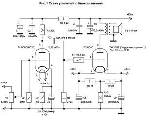 Статья была бы не полной, если не привести схему усилителя, в выходном каскаде которого работает триод косвенного накала. Я выбрал 6С41С, поскольку схем с использованием этой лампы очень мало, в отличие от 6С33С.
