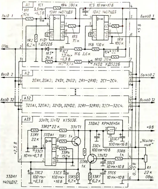 Принципиальная схема усилительного устройства представлена на рис. 1 Оно состоит из одинаковых усилительных каналов А1-А32 и общего для всех каналов блока управления АЗЗ. Регулируют коэффициент усиления каналов резистором R1 "Усиление" Каналы А1-А32 идентичны по схеме, поэтому далее описан только А1