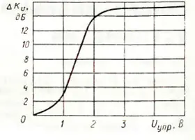 На рис. 2 показана зависимость приращения коэффициента усиления напряжения DeltaКи относительно его минимального значения, равного 175 и принятого за нуль, от напряжения управления UNnP, измеренного на среднем по схеме выводе резистора R1 "Усиление".