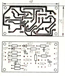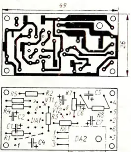 в усилительном устройстве применены оксидно-полупроводниковые тантало-вые конденсаторы К53-56 и керамические К10-17в. рассчитанные на поверхностный монтаж. Все конденсаторы припаяны к плате со стороны печати. Резисторы - С2-29В и С2-33, резистор R1 "Усиление" - СП4-1а Транзисторы КТ503Б можно заменить любыми кремниевыми п-р-п транзисторами с аналогичными параметрами. Микросхемы 1407УДЗ и 140УД12 можно заменить на К1407УДЗ и К140УД12. 140УД1201 К140УД1201, ,иА776Н соответственно. Вместо КР142ЕН5А можно использовать стабилизатор 7805.