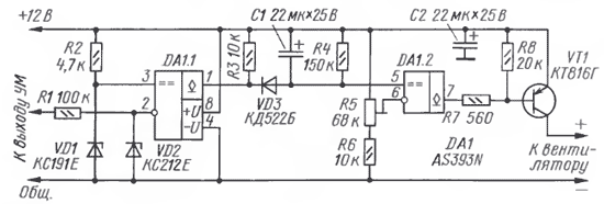 Микросхема DA1 содержит два независимых компаратора. На первом из них собран узел, определяющий, что выходная мощность усилителя превышает некоторый пороговый уровень, а на втором — узел задержки выключения вентилятора.