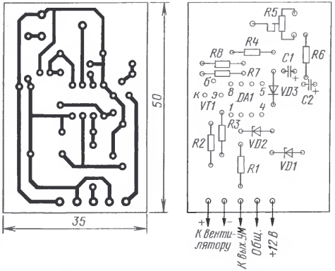 В устройстве применены резисторы МЛТ-0,125 или подобные, конденсаторы — К50-35 или аналогичные импортные. Диод VD3 — любой кремниевый серий КД503, КД521, КД522. Транзистор VT1— КТ816 с любым буквенным индексом. Вентилятор должен быть рассчитан на постоянное напряжение 12 В и ток потребления не более 0,5 А. При подключении вентиляторов с током потребления более 150 мА транзистор VT1 необходимо установить на небольшой теплоотвод. Напряжение питания может быть увеличено до 24 В, но при этом последовательно с вентилятором необходимо включить гасящий резистор соответствующего сопротивления или использовать два последовательно включенных вентилятора.