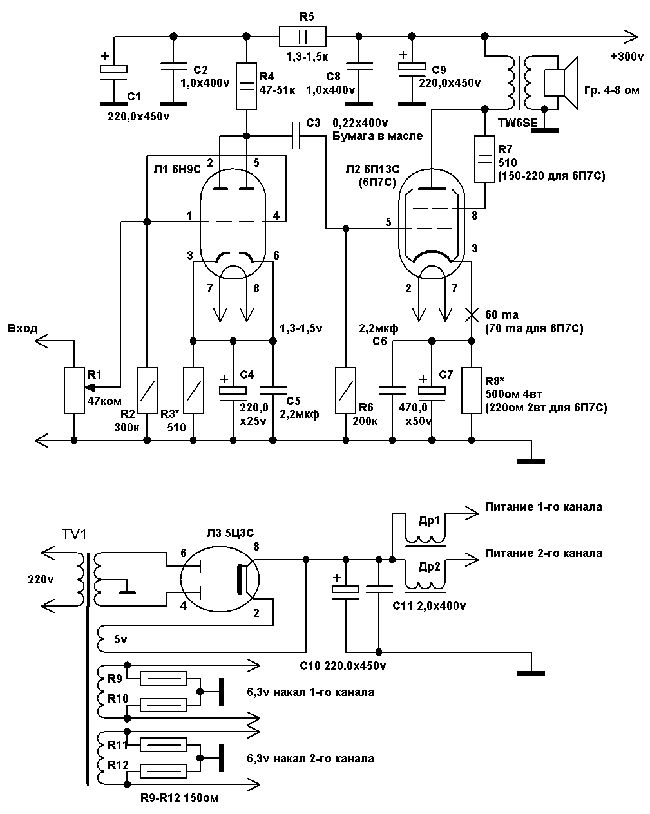 Выходной каскад выполнен на лучевом тетроде 6П13С, включенном триодом. Именно триодное включение наиболее оптимально с точки зрения качества звучания. Выходной каскад особенностей не имеет. Единственное, что придется сделать, это подобрать с помощью резистора R8, ток через лампу в пределах 60-65 ma. Этот резистор можно составить из двух, параллельно соединенных резисторов, например по 1 ком 2 вт. Если есть желание, можно применить распространенную лампу 6П3С или 6П7С. Ток покоя выходного каскада в этом случае должен быть в пределах 70-75 ma. Однако хочу заметить, что в этом случае уменьшится мощность до 2х Ватт (при применении 6П3С) и увеличится суммарный коэффициент гармоник усилителя. Я пробовал лампу 6П7С и хочу отметить, что звучит она неплохо. При ее применении резистор в цепи автоматического смещения подбирается в пределах 220-230ом 2вт, а резистор между второй сеткой и анодом в пределах 150-230ом 2вт. Ток покоя в этом случае составит около 70 ma. Выходная мощность усилителя в этом случае будет около 3вт на канал.