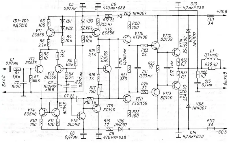 Выходной каскад, собранный на транзисторах VT10-VT15, представляет собой трёхступенчатый эмиттер-ный повторитель. Транзистор VT7 задаёт его ток покоя и осуществляет термокомпенсацию смещения для мощных транзисторов. Транзистор VT6 является источником стабильного тока для эмиттерного повторителя и цепи смещения на VT7. Цепь R28C15 предохраняет УМЗЧ от самовозбуждения на высоких частотах. Цепь L1R29 повышает устойчивость усилителя при ёмкостном характере нагрузки. Диоды VD7, VD8 защищают выходные транзисторы от напряжения обратной полярности, а резисторы R26, R27 повышают термостабильность режима. Конденсатор С7 - фазокорректирующий, он обеспечивает устойчивость усилителя при охвате его общей обратной связью (ООС).