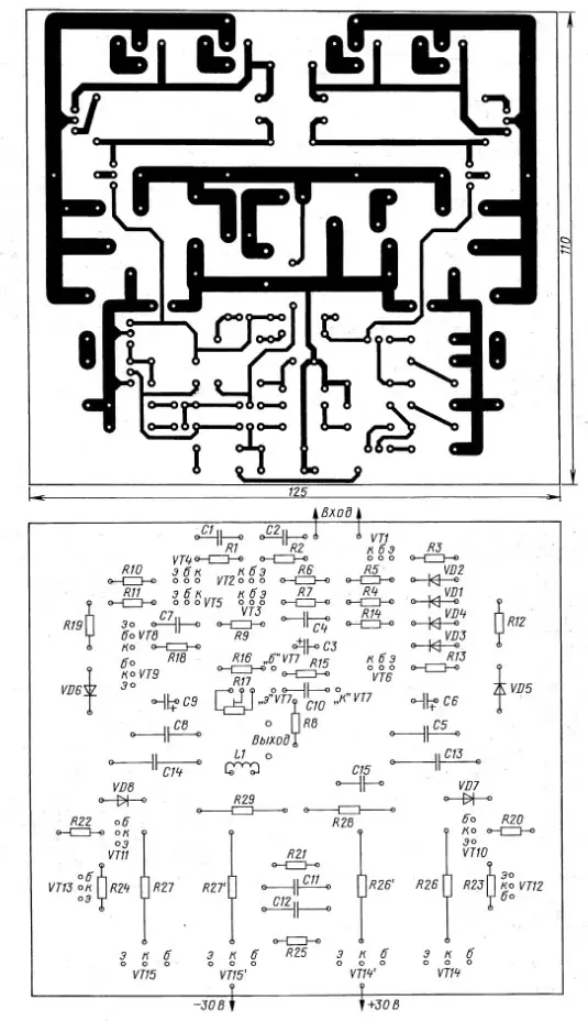 Усилитель собран на печатной плате размерами 125x110 мм. Один из её вариантов показан на рис. 2,а, а соответствующее расположение деталей - на рис. 2,6. На плате предусмотрено место под вторую пару выходных транзисторов. Это может быть необходимо, например, при увеличении выходной мощности или при использовании менее мощных транзисторов. В целом усилитель не требует особого монтажа, следует лишь придерживаться общеизвестных правил. Провода подключения блока питания и нагрузки сечением не менее 2,5 мм2 должны быть свиты по всей длине с шагом 10... 15 мм, их монтируют без жгутов. Вход усилителя подключают экранированным проводом.