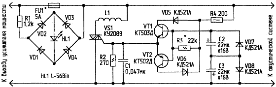 В качестве прототипа взята схема устройства защиты усилителя "405" ф."Quad", но приняты меры по предотвращению самопроизвольного открывания симистора при высокой скорости нарастания выходного напряжения, которая бывает в современных УМЗЧ. Дополнительно введена световая индикация перегорания предохранителя на мигающем светодиоде при срабатывании защиты.