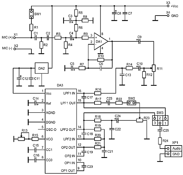 Ревербератор состоит из двух объединенных блоков: блока предусилителя и блока самого ревербератора. Блок предусилителя выполнен на ОУ 4558 или 358 (DA1). Коэффициент усиления выбран около 40 дБ (определяется отношением R10/R7) в расчете работы предусилителя напрямую с микрофоном. Если в качестве источника сигнала используется линейный выход звуковоспроизводящего оборудования (250 мВ), рекомендуется снизить коэффициент усиления до 6 дБ (резистор R7=22 кОм). Потенциометр R11 предназначен для регулировки уровня сигнала, снимаемого с предусилителя. При использовании электретного микрофона переключатель SW1 необходимо замкнуть, а при использовании динамического микрофона - разомкнуть.