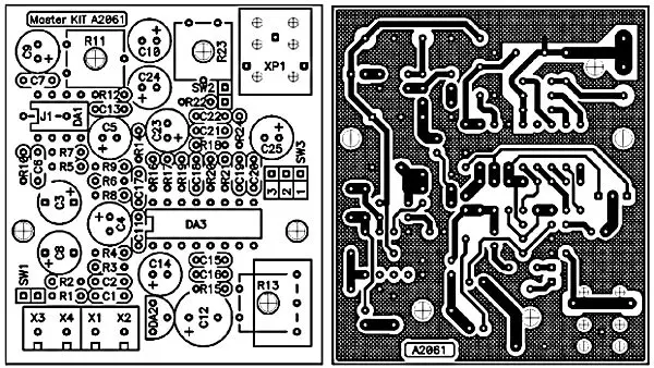 Рис.3. Печатная плата и расположение элементов ревербератора