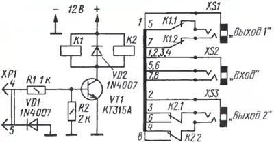 Схема прибора приведена на рис. 2. Коммутация сигнала производится с помощью двух электромагнитных реле К1 и К2. Сигнал поступает на разъем XS2 "Вход" и, в зависимости от состояний реле, попадает на разъем XS1 "Выход 1", предназначенный для подключения головных телефонов, или XS3 "Выход 2" - для колонок. В настоящей конструкции имеет принципиальное значение, к какому выходу подключены колонки, так как при отсутствии сигнала вход их усилителя лучше соединить с общим проводом во избежание шума, это и предусмотрено для выхода 2. Напряжение на реле подается через транзистор VT1. На выходах СОМ порта следующие уровни напряжения: лог. 1 соответствует напряжению -5...-15 В, а лог. О - напряжению +5... 15 В. Электронный ключ, собранный на транзисторе VT1 и резисторах R1 и R2, должен управляться напряжением 0/+5 В; для исключения напряжения минусовой полярности включен диод VD1. Диод VD2 защищает транзистор VT1 от ЭДС самоиндукции при выключении реле. Мной были использованы диоды 1 N4007, но подойдут и более популярные, например КД522Б
