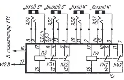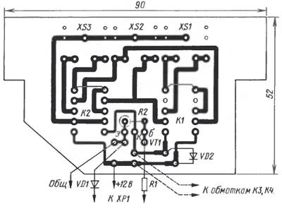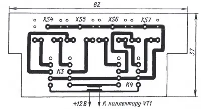 Схема дополнительного узла представлена на рис. 3, а печатные платы устройства - на рис. 4, 5 соответственно. Обмотки реле КЗ и К4 нужно подключить параллельно К1 и К2 (это соединение можно выполнить разъемным), но следует учесть, что предельный ток через транзистор КТ315А составляет 100 мА. Если суммарный ток питания реле превышает 80 мА, следует использовать более мощный транзистор, например КТ972Б, но при этом изменив сопротивление резистора R1 на 3,9 кОм и R2 на 1,5 кОм.