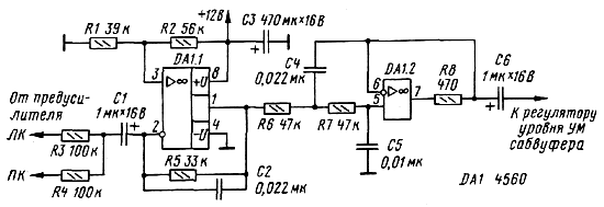 На ОУ DA1.1 выполнен инвертирующий сумматор, совмещенный с фильтром первого порядка, на ОУ DA1.2 — активный фильтр Баттерворта второго порядка. Частота среза получившегося в итоге фильтра третьего порядка составляет примерно 180 Гц. Делитель R1R2 задает режим ОУ по постоянному току. Полоса частот громкоговорителей СЧ—ВЧ (сателлитов) ограничена фильтрами первого порядка на входе стереофонического УМЗЧ.