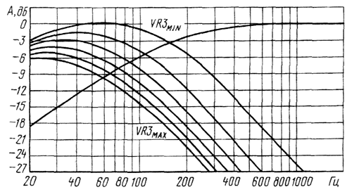 Кроме того, эта мера автоматически исключает перегрузку каскада на транзисторе VT1 по входу: за счет разницы в усилении ограничение сигнала на выходе мостового усилителя начнется раньше, чем на обычных выходах (откуда и берется сигнал для VT1). Благодаря глубокой ООС через резисторы R4, R5 линейность каскада удовлетворительна и при больших сигналах. Режим каскада по постоянному току обеспечивается за счет подключения цепи VR3R1 к конденсатору С13. На этом конденсаторе присутствует постоянное напряжение, примерно равное половине напряжения питания.