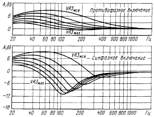 На рис. 4 показаны теоретические АЧХ в ближнем поле излучения для случаев синфазного и противофазного включения головок при их компактной установке. Реальные АЧХ по звуковому давлению в зависимости от расстояний и характеристик головок могут принимать еще более причудливые формы. Очевидно, что введение переключателя фазы позволяет более гибко управлять результирующей АЧХ.