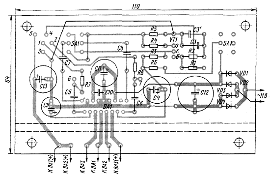 Ввиду относительной простоты усилитель вполне можно собрать на макетной плате (в таком варианте он работал у автора). Для журнальной публикации была разработана печатная плата (рис. 5), на которой размещается большинство деталей. Плата рассчитана на установку переключателей П2К на два направления и упомянутых выше деталей. Конденсатор СЗ емкостью 0,15 мкФ в случае необходимости можно составить из конденсаторов емкостью 0,1 мкФ и 0,047 мкФ, для чего на плате предусмотрены дополнительные контактные площадки.
