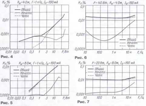 На рис. 4 и 5 показаны зависимости общего коэффициента гармоник (THD), а также коэффициентов четных (EVEN) и нечетных (ODD) гармоник от выходной мощности на частоте 1 кГц при сопротивлении нагрузки 4 и 8 Ом соответственно, на рис. 6 и 7 - то же, от частоты при выходной мощности 40 Вт на нагрузке 4 Ом и 20 Вт на нагрузке 8 Ом.