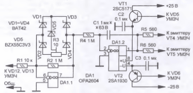 Возможная схема такого устройства в усилителе показана на рис. 8; это - вариант реализации нелинейной ООС по постоянному току [11, 12] с линейным участком возле нуля передаточной характеристики. Первый каскад на ОУ DA1.1 усиливает напряжение с выхода УМЗЧ и симметрично ограничивает его, причем для малых амплитуд сигнала каскад практически линеен. Второй - на ОУ DA1.2 - представляет собой интегратор, с выхода которого ток через резисторы R5, R6 подается в точки суммирования токов общей ООС усилителя мощности. Транзисторы VT1, VT2 формируют стабилизированное напряжение питания для ОУ (+/-6,8 В). Если в УМЗЧ установить интегральные стабилизаторы (см. выше), эти транзисторы можно исключить, подав питание на ОУ со стабилизаторов через резисторы (10 Ом, 0,125 Вт).