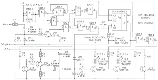 Через конденсатор С6 импульсы с выхода элемента DD4.3 поступают на входы установки в нулевое состояние счетчика DD5. Поэтому при исправной линии счетчик остается в этом состоянии, транзистор VT5 закрыт, а светодиод HL2 погашен.