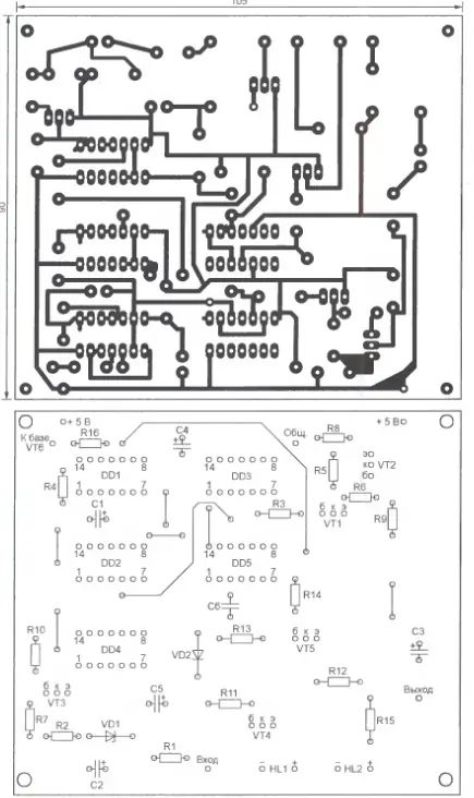 Сигнализатор собран на печатной плате, изображенной на рис. 2. Здесь установлены все детали, кроме транзистора VT6 с излучателем звука НА1 и све-тодиодов HL1, HL2. Эти элементы вынесены на переднюю панель корпуса от малогабаритного радиоприемника, в который помещена плата. На стенках корпуса размещены зажимы для подключения контролируемой линии и разъем питания.