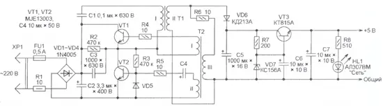 К выходу выпрямителя на диоде VD6 подключен стабилизатор напряжения на стабилитроне VD7 и транзисторе VT3. Мощность, рассеиваемая на этом транзисторе, невелика, поэтому он может работать без теплоотвода. О наличии напряжения на выходе блока сигнализирует светодиод HL1.