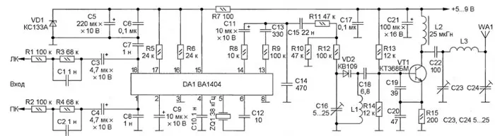 В предлагаемом стереопередатчике микросхема ВА1404 через частотный модулятор управляет генератором, поэтому радиочастотные узлы микросхемы не использованы. Схема стереопередатчика показана на рис. 1. Входной звуковой стереосигнал подаётся на выводы 1 (правый канал) и 18 (левый канал) микросхемы ВА1404 (DA1) через стандартные корректирующие цепи частотных предыскажений R1R3C1 и R2R4C2, а также конденсаторы СЗ и С4. Микросхема ВА1404 - стереокодер системы радиовещания CCIR с подне-сущей частотой 38 кГц и пилот-тоном 19 кГц. Для питания микросхемы DA1 применён параметрический стабилизатор напряжения 3,3 В на резисторе R7 и стабилитроне VD1.