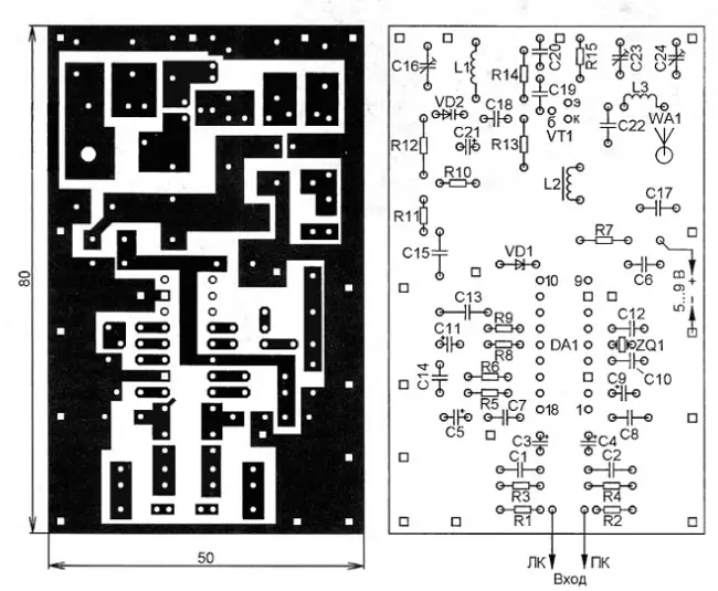1.5 мм и размерами 80x50 мм. Чертёж платы показан на рис. 2. Со стороны деталей фольга соединена с общим проводом и оставлена почти на всей поверхности платы, за исключением вывода антенны, вокруг которого она удалена на 2 мм. В местах, обозначенных квадратами, просверлены отверстия. В них вставлены отрезки медного провода или выводы соответствующих деталей, которые припаяны к фольге с обеих сторон платы. Отверстия под контакты деталей, которые не имеют соединения с общим проводом, раззенкованы сверлом по металлу диаметром 3.5 мм так, чтобы исключить замыкание вставленных в них проводников с общим проводом. Внешний вид платы показан на фото рис. 3.