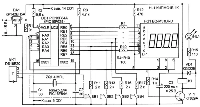 В приборе могут работать микроконтроллеры PIC16F84A или PIC16F628, но каждый по своей программе. Для микроконтроллера PIC16F628 кварцевый резонатор ZQ1 и конденсаторы С1, С2 не требуются. Его тактирование будет происходить от встроенного RC-генератора.