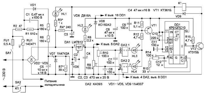 Схема УЗ представлена на рис. 1. Узел питания выполнен по классической бестрансформаторной схеме с гасящим конденсатором. Варистор RU1 вместе с плавкой вставкой FU1 защищает устройство от значительного превышения напряжения сети. Но если установить конденсатор С1 с допустимым переменным напряжением не менее 400 В, варистор можно не устанавливать. В этом случае УЗ сможет работать даже при повышении напряжения сети вплоть до 400 В. Не желательно ставить плавкую вставку на ток более 0,5 А. Это позволит сохранить "жизнь" защитного стабилитрона VD6 и повысит шансы сохранить работоспособность УЗ при возможном пробое балластного конденсатора. Стабилитрон VD6 ограничивает выходное напряжение выпрямителя. Выключатель SА1 обесточивает устройство, а выключатель SА2 позволяет при необходимости питать холодильник напрямую от сети. Этот выключатель можно не устанавливать, но в моём случае розетка установлена прямо за холодильником, и если УЗ по какой-либо причине вышло из строя, а отремонтировать его сразу нет возможности, чтобы не отодвигать холодильник, можно просто включить его выключателем SA2.