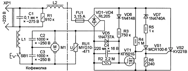 По мере зарядки конденсатора С4 напряжение между затвором и истоком транзистора VT1 увеличивается. Когда оно достигнет порогового, транзистор станет открываться и через него потечет часть тока, протекавшего ранее через управляющий переход тринистора VS1 В результате оба тринистора в каждом полупериоде будут открываться позже, чем в предыдущем. Ток зарядки конденсатора С4 увеличится, и процесс пойдет лавинообразно. Он закончится полным прекращением открываний тринисторов. Двигатель кофемолки остановится. Стабилитрон VD5 ограничивает напряжение на конденсаторе С4 и затворе транзистора VD1 на допустимом для этих элементов уровне.
