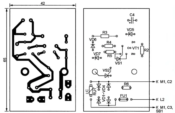 Таймер может быть смонтирован на печатной плате размерами 65x42 мм, показанной на рис. 2. Эту плату располагают внутри корпуса кофемолки, где свободного места для нее достаточно.