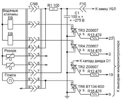 Опишу принцип, по которому я доработал модуль MINISEL. Части его схемы находятся на страницах 6 и 7 в [2]. На фрагменте, изображённом на рис. 1, показаны симисторы TR2, управляющий УБЛ, TR3 и TR4, управляющие клапанами подачи воды, и TR6, управляющий помпой.