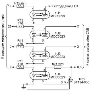 Я применил схему развязки оптронами выходов микроконтроллера и силовых цепей, показанную на рис. 2. Резисторы R12-R14 и R18, симистор TR6, диод D1 и разъём CNB - элементы модуля, поэтому их позиционные обозначения оставлены оригинальными. У вновь установленных элементов к ним добавлен префикс 1. Маломощные симисторы TR2-TR4 (Z00607) заменены симисторными оптронами 1U1-1U3 (MOC3023), а такой же оптрон 1U4 управляет мощным симистором TR6 (BT134). Теперь в случае нештатной ситуации выйдут из строя только оптроны. Поскольку входной ток срабатывания оптронов MOC3023 всего 5 мА, изменять номиналы резисторов R12- R14 и R18 не требуется.