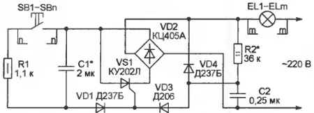 На управляющий электрод тринистора через диод VD3 поступает также напряжение с фазосдвигающей цепи R2C2. Подбором ее элементов можно добиться того, что в интервалах между включениями освещения с помощью кнопок SA1-SAn лампы будут тускло светиться, потребляя минимальную мощность. При указанных на схеме номиналах резистора R2 и конденсатора С2 потребляемая лампами мощность около 12 % номинальной, а яркость их свечения достаточна, чтобы найти кнопку в темном подъезде.