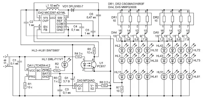Схема резервного маломощного светильника изображена на рисунке. Мощность светильника - 4,8 Вт. В основном такие светильники используются для освещения, например, кухни, ванной комнаты и других подобных помещений. В основе светильника применён драйвер светодиодов DA2 (MIC2297-42YML) [1]. Это повышающий драйвер с выходным напряжением до 42 В при входном 2,5...10 В. Такой драйвер может легко питать цепь из последовательно включённых десяти светодиодов с падением напряжения 3...4 В на каждом. В светильнике применяются светодиоды белого свечения с максимальным током 30 мА и падением напряжения 3...3,1 В. Для увеличения числа светодиодов до 80 применяется токовое зеркало на транзисторных сборках DA4, DA5. Ток задаёт резистор R7. Датчик пропадания напряжения питания 5В - оптрон U1. При наличии этого напряжения транзистор оптрона открыт, и на вход EN (выв. 4 DA2) подаётся лог. 0, запрещающий работу драйвера. При отсутствии напряжения питания транзистор закрывается, и на входе EN будет лог. 1, разрешающая работу драйвера.