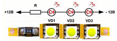 Здесь стоит отметить, что указанный тип подключения соответствует и светодиодным лентам, ведь внутри отдельные светодиоды соединяются так же, как и в примере выше – последовательно (рисунок ниже).