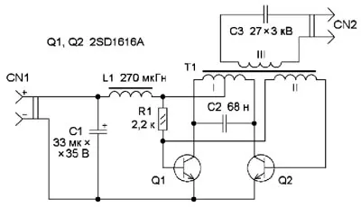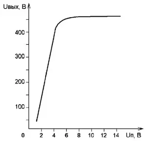 Номинальное напряжение питания преобразователя - 12 В, но он работает в интервале напряжений 1,5...15 В, при этом выходное напряжение практически линейно зависит от входного. Это позволяет из менять его выходное напряжение изменением напряжения питания. Балластный конденсатор С3, который установлен на выходе преобразователя, ограничивает выходной ток в случае возникновения короткого замыкания в нагрузке.