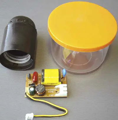 Для изготовления устройства, кроме преобразователя, потребуются патрон для лампы и пластмассовый корпус подходящего размера (рис. 2). На корпусе можно установить несколько патронов для ламп с цоколем Е27, Е14 и других, их контакты соединяют параллельно.