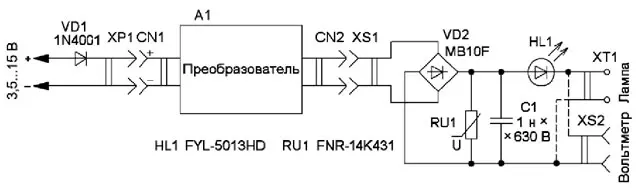 Схема устройства показана на рис. 3. ДиодУ01 защищает преобразователь от неправильной полярности питающего напряжения. Выходное напряжение преобразователя выпрямляет диодный мост VD2, варистор RU1 ограничивает выходное постоянное напряжение на уровне 450...480 В. Наличие диодного моста необходимо. Дело в том, что большинство светодиодных ламп имеют в своём составе выпрямитель, казалось бы, такой выпрямитель в устройстве не нужен. Но в некоторых лампах в цепи питания установлены помехоподавляющие LC-фильтры или С-фильтры, которые не пропустят высо-кочастотное переменное напряжение преобразователя, но без проблем пропустят постоянное напряжение. Светодиод HL1 служит индикатором протекания тока через нагрузку.