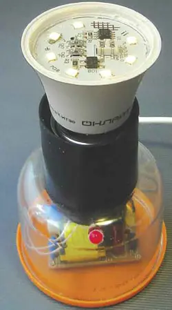 Для контроля напряжения на лампе параллельно патрону ХТ1 можно подключить вольтметр, для этого на корпусе устройства надо установить гнёзда подходящей конструкции. Вольтметр желательно применить с входным сопротивлением 10 МОм и более, это повысит точность измерения напряжения. Внешний вид смонтированного устройства в действии показан на рис. 5. Светодиоды лампы слабо светят.