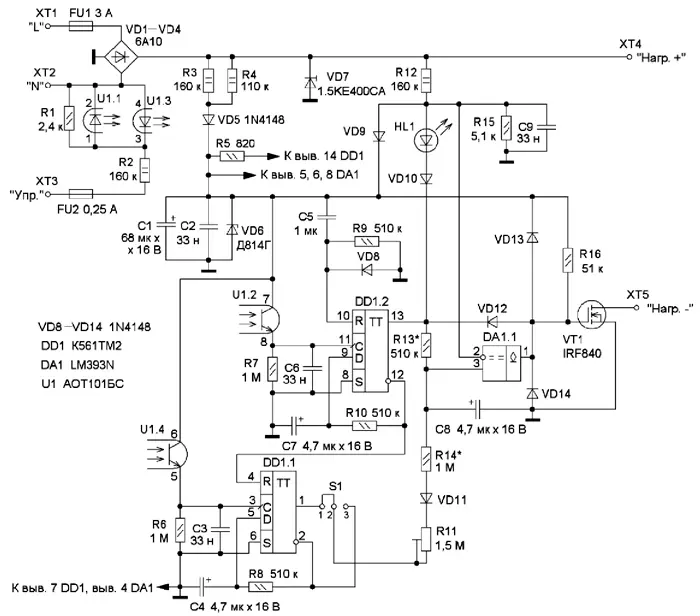 Схема устройства приведена на рис. 1. При подаче питающего напряжения с помощью цепи С5R9 триггер DD1.2 устанавливается в исходное состояние - на его прямом выходе присутствует низкий логический уровень, поэтому конденсатор С8 разряжен. Светодиод HL1 при этом светит, так как диод VD10 открыт. Для включения нагрузки (ламп накаливания) необходимо соединить клемму ХТ3 "Упр." с фазным проводом сети (клеммой ХТ1) через нормально разомкнутые контакты кнопки и диод, катод которого соединён с клеммой ХТ3. При замыкании контактов кнопки через излучающий диод оптопары U1.1 начинает протекать ток, в результате чего фототранзистор U1.2 открывается и на тактовом входе триггера DD1.2 появляется положительный перепад напряжения, устанавливающий триггер в единичное состояние.