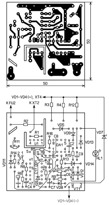 Детали устройства, за исключением диодного моста VD1-VD4 и плавких вставок FU1, FU2, смонтированы на печатной плате из одностороннего фольгированного стеклотекстолита толщиной 1,5...2 мм, чертёж которой приведён на рис. 2. Для предотвращения электрического пробоя по поверхности платы между печатными проводниками с большой разностью потенциалов сделаны прорези шириной 1,5...2 мм. Все имеющиеся на плате перемычки выполняют из изолированного монтажного провода и устанавливают после монтажа всех остальных деталей. Конденсатор С1 устанавливают над микросхемой DD1, а для предотвращения замыкания между конденсатором и стабилитроном на корпус последнего надевают отрезок термоусаживаемой трубки.