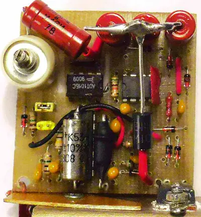Резисторы R3, R4, R12 устанавливают перпендикулярно плате, а их свободные выводы спаивают между собой и к получившейся шине припаивают один из выводов супрессора VD7. Применение параллельного включения резисторов R3, R4 обусловлено желанием автора максимально снизить нагрев каждого из них, так как в собранной конструкции эти элементы находятся в непосредственной близости от пластмассового корпуса устройства. Если к степени нагрева резисторов особых требований не предъявляется, то вместо R3, R4 можно установить один резистор сопротивлением 62...75 кОм и мощностью 2 Вт.