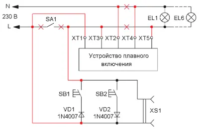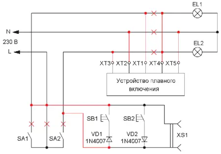 Конструктивное исполнение устройства зависит от места его размещения. Если внутри корпуса люстры имеется достаточно свободного места, а сама люстра подключена к сети по трёхпроводной схеме с использованием двухклавишного выключателя, устройство наиболее целесообразно разместить в корпусе люстры и подключить по схеме, приведённой на рис. 4. Вновь введённые элементы и соединения выделены цветом. Как видно из схемы, все имеющиеся в люстре лампы следует соединить параллельно и подключить к выходу устройства, а вместо штатного двухклавишного сетевого выключателя SA1 и SA2 установить кнопки SB1 и SB2. Диоды VD1, VD2 - любые с допустимым обратным напряжением не менее 400 В, а к розетке XS1 при необходимости можно подключить выносной пульт (или пульты) управления люстрой, построенный также с применением кнопок и диодов.