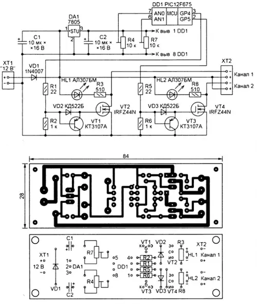Светодиодные лампы на 12 В обоих каналов подключают к винтовой колодке ХТ2. Работу каждого канала можно контролировать по вспышкам светодио-дов HL1 и HL2.