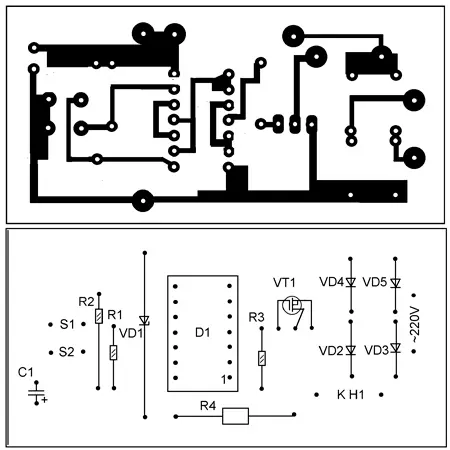 Все, кроме блоков управления и лампы, расположено на одной печатной плате с односторонними печатными дорожками. Схема и разводка платы приводится на рис.2.
