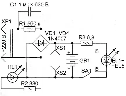 Потребляемый фонарём от сети ток ограничен ёмкостным сопротивлением конденсатора С1 приблизительно до 60 мА. Поскольку часть его ответвляется в светодиод HL1, ток зарядки батарей GB1 получается около 50 мА. Гнёзда XS1 и XS2 предназначены для измерения напряжения батареи.
